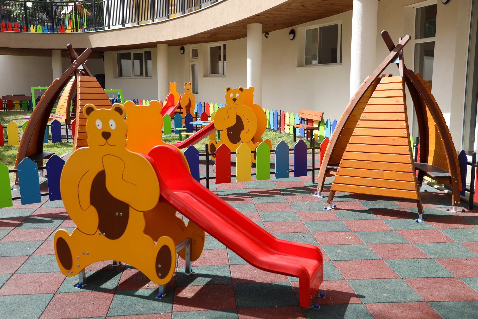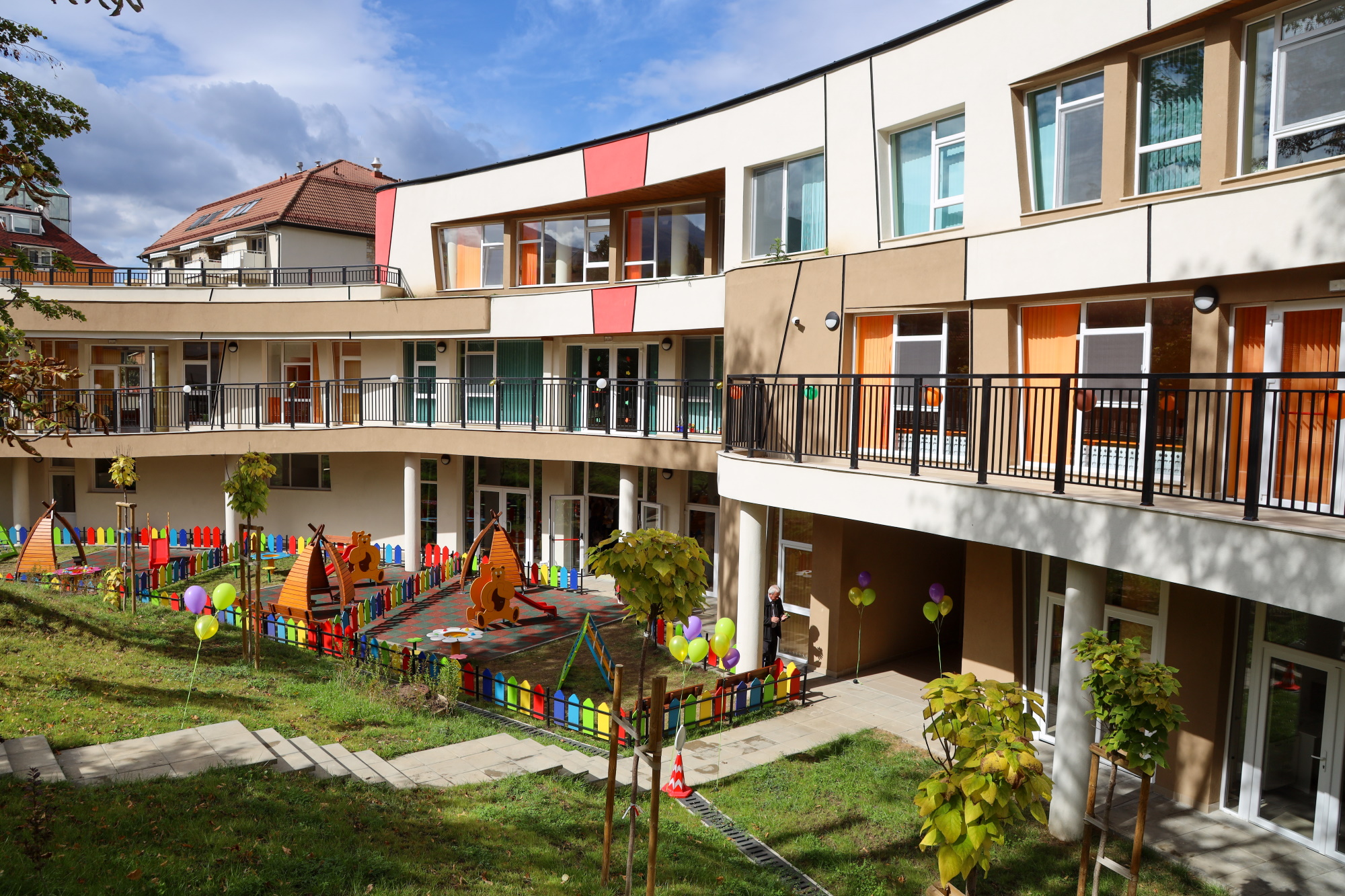 Детска градина разполага със занимални и спални помещения за 5 групи, зала за музика и спорт, кухня за приготвяне на храна. Красивата сграда е хармонично вписана в терена, като детските площадки са разположени терасовидно сред дървета и озеленяване.