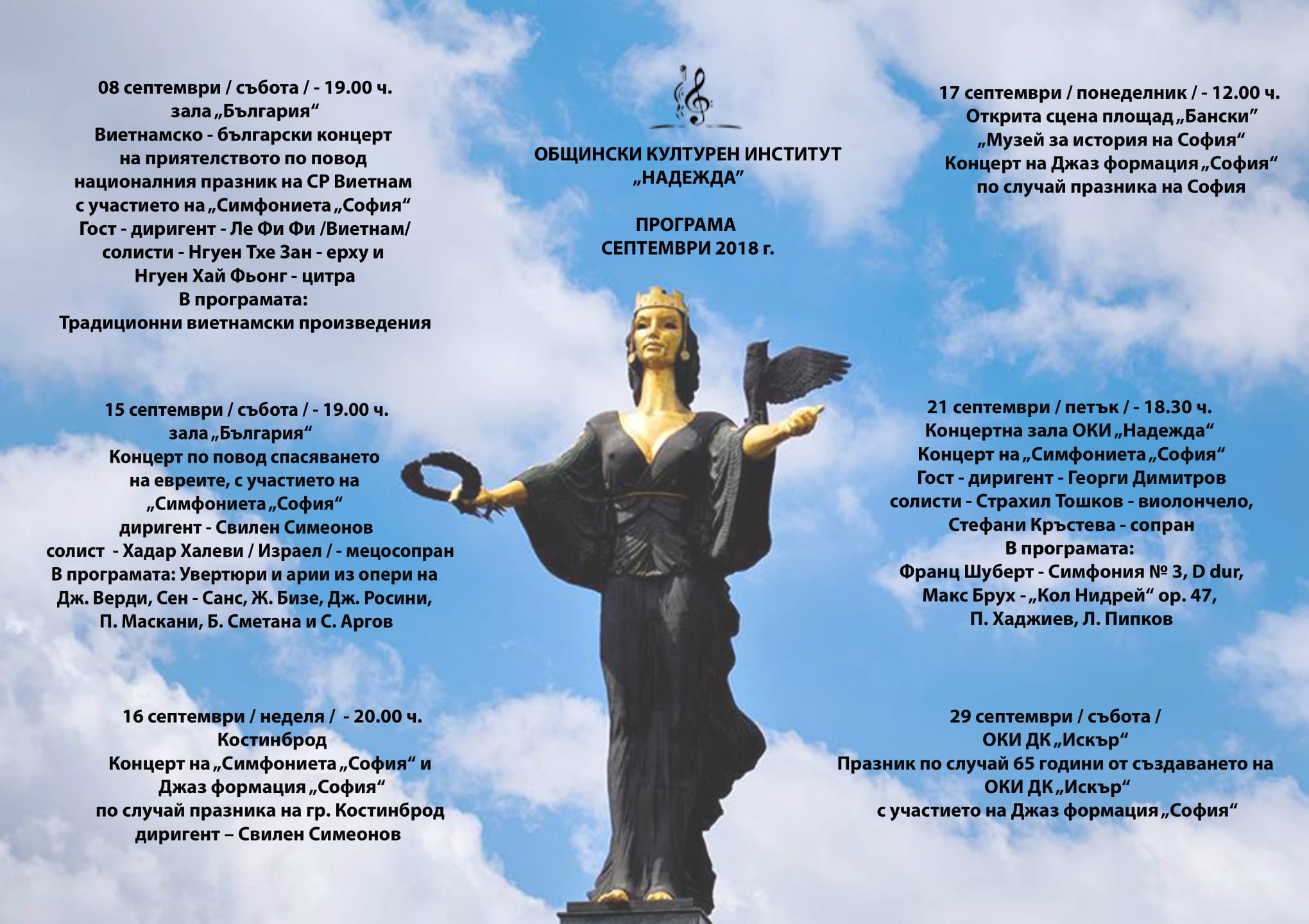 Виетнамско-български концерт на приятелството по повод националния празник на СР Виетнам с участието на: ”Симфониета ”София" гост-диригент – Ле Фи Фи (Виетнам), солисти: Нгуен Тхе Зан – ерху и Нгуен Хай Фьонг – цитра. В програмата: Традиционни виетнамски произведения