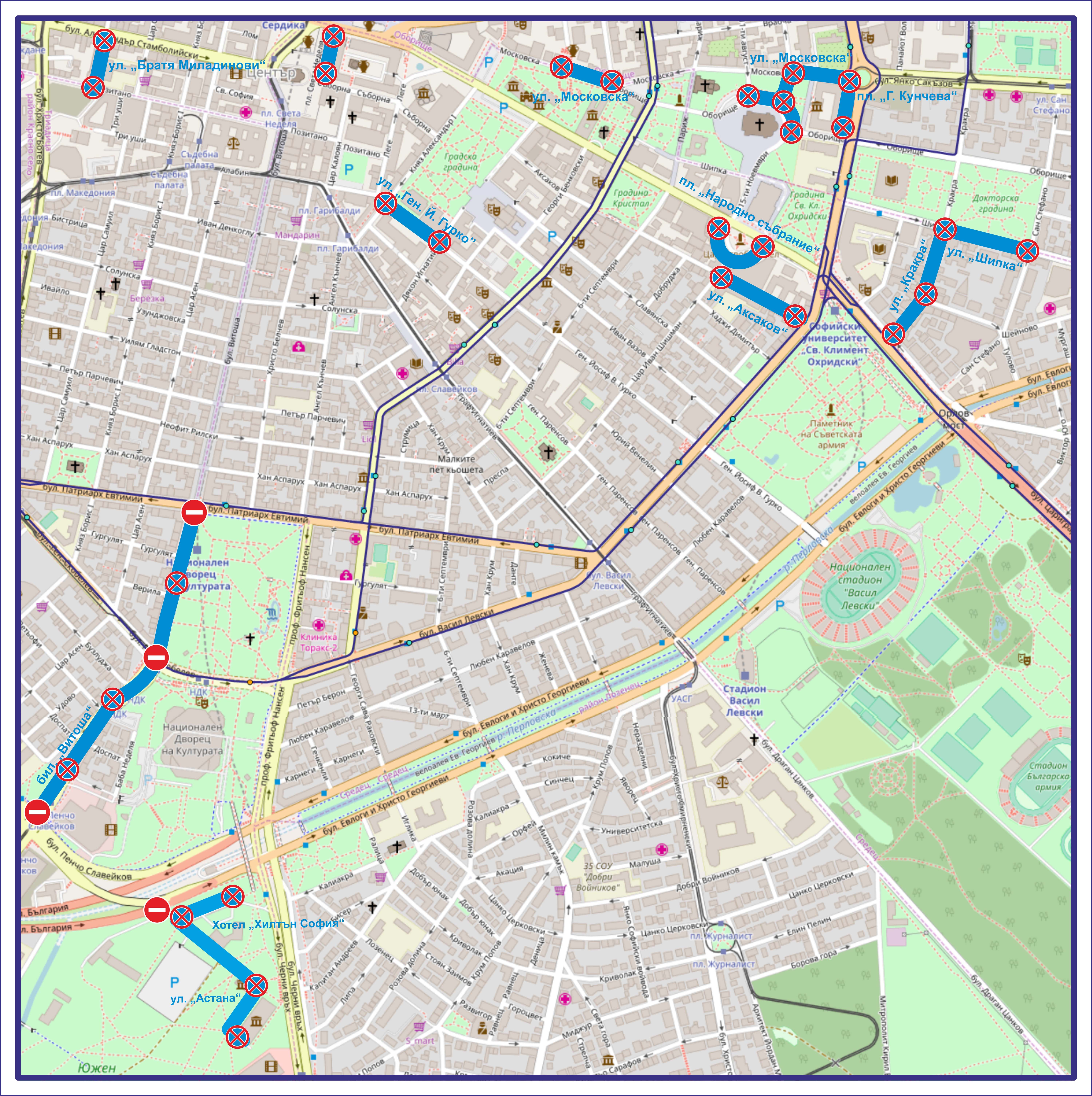 - От 08.00 часа на 16.05.2018 г. до 20.00 часа на 17.05.2018 г. по ул. „Ген. Й. Гурко” между ул. „Дякон Игнатий” и ул. „Кн. Александър І”;
