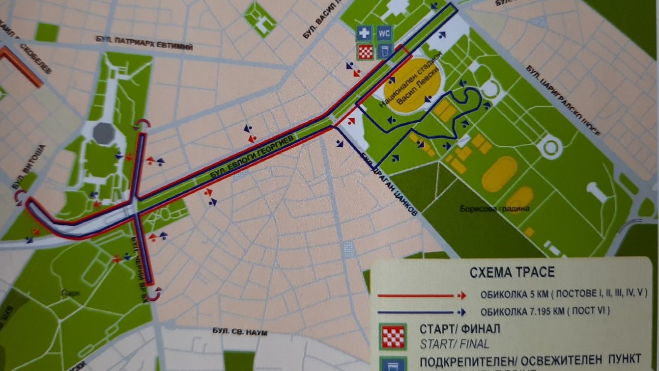 От 09.00 до 13.30 часа на 6 септември 2020 г. се провежда щафетен маратон, който ще се проведе по следния маршрут: от северозападното пътно платно на бул. „Евлоги и Христо Георгиеви” пред националния стадион „Васил Левски” по западното пътно платно на бул. „Евлоги и Христо Георгиеви”, по източното пътно платно на ул. „Проф. Фритьоф Нансен”, обратен завой при бул.„Васил Левски”, по западното пътно платно на ул. „Проф. Фритьоф Нансен”, надясно по бул. „България”, по източното пътно платно на бул. „Пенчо Славейков”, обратен завой по тротоара на бул.„Витоша”, по западното пътно платно на бул.„Пенчо Славейков”, по бул. „България”, надясно по западното пътно платно на бул.„Черни връх”, обратен завой при ул. „Св. Наум”, по източното пътно платно на бул. „Черни връх”, надясно по югоизточното пътно платно на бул. „Евлоги и Христо Георгиеви”, бул. „Драган Цанков”, Борисова градина, изход от Борисова градина при Национален стадион „Васил Левски”, по югоизточното пътно платно на бул. „Евлоги и Христо Георгиеви” до Орлов мост, преминава по пешеходната зона, по северозападното пътно платно на бул. „Евлоги и Христо Георгиеви” до национален стадион „Васил Левски”, където е финала.