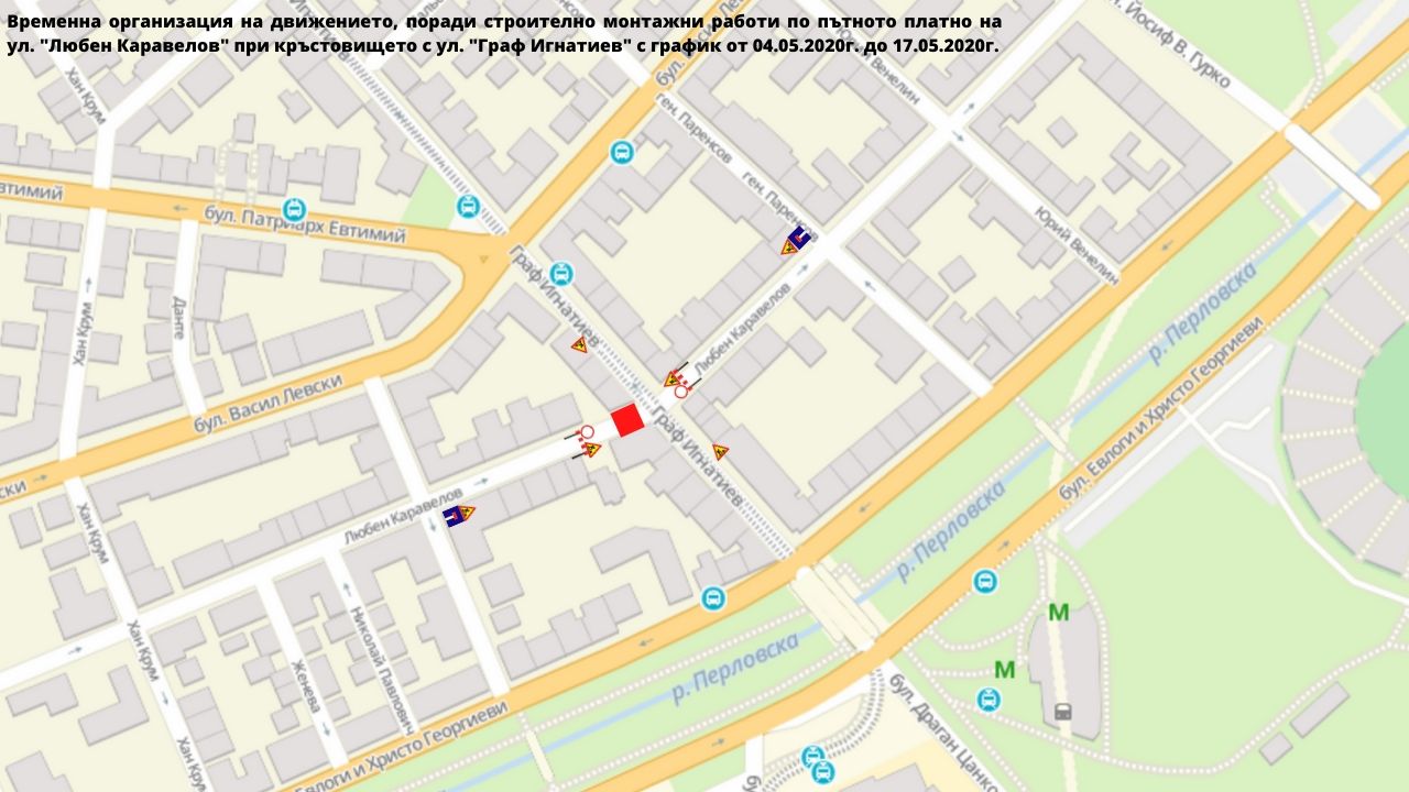 От 04.05.2020 г. до 17.05.2020 г. (включително) се забранява влизането на пътни превозни средства през кръстовище ул. „Граф Игнатиев” – ул. „Любен Каравелов” с изключение на превозните средства от редовните линии за обществен превоз на пътници.