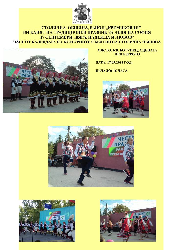Празникът на селищата от район „Кремиковци”, посветен на Деня на София, ще се проведе на 17 септември, понеделник, в квартал „Ботунец” от 16.00 часа на откритата сцена при езерото.