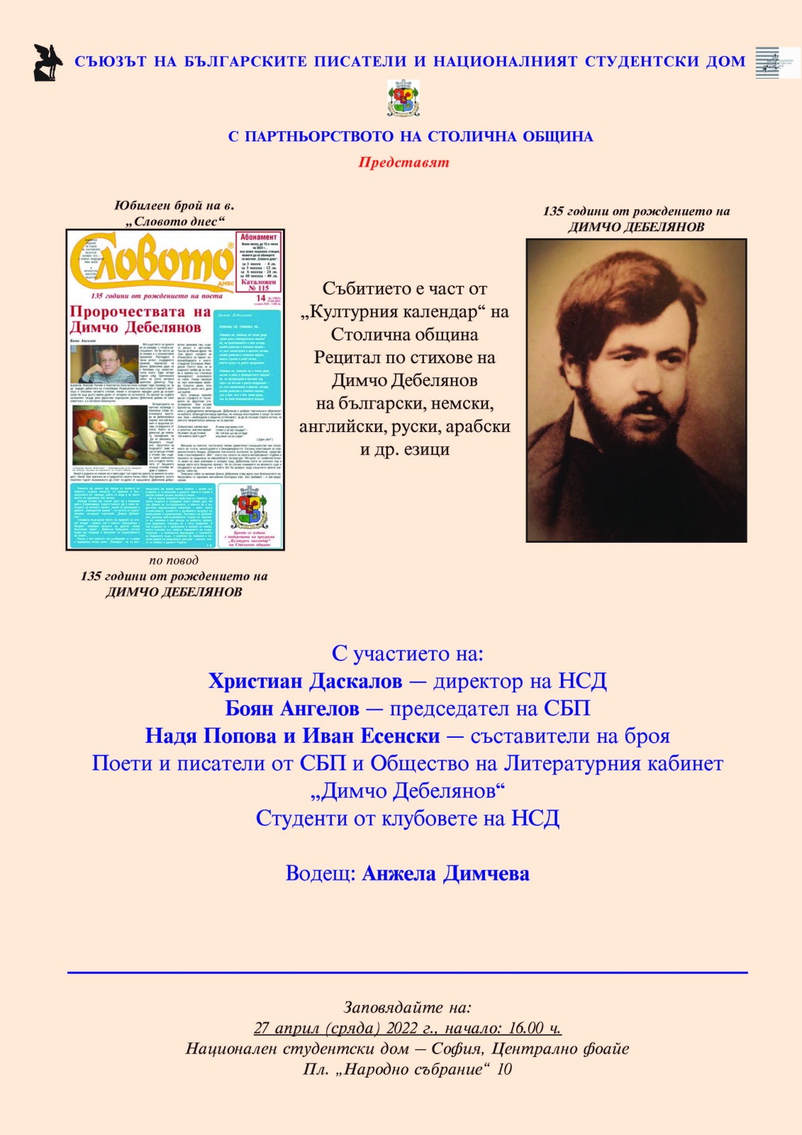 На 27 април от 16.00 часа в Националния студентски дом ще бъде представен юбилеен брой на вестник "Словото днес", посветен на 135 години от рождението на Димчо Дебелянов.