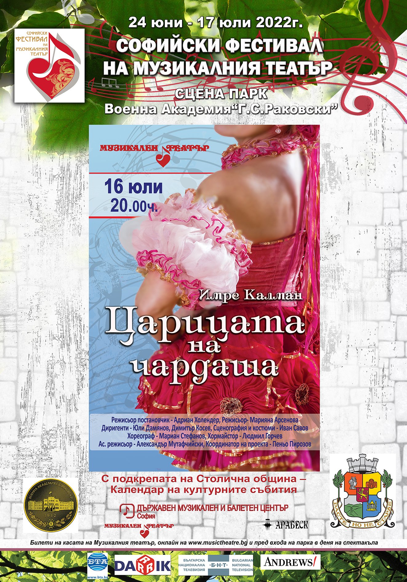 На 16 юли от 20:00 часа Софийският фестивал на музикалния театър публиката ще може да се наслади на „Царицата на чардаша”. На сцената в парка на Военната академия „Г. С. Раковски“ ще видим класическата и в същото време модерна трактовка на Музикалния театър на оперетата на Калман, която ни пренася в бляскавата атмосфера на Австро-Унгарската империя. Почитателите на оперетата ще се насладят на богатата оркестрация в музиката на Калман, увличащото и изпълнено с комични обрати либрето, динамичната хореография и красивите костюми и сценография.