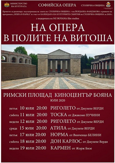 Софийската опера и Столична община канят ценителите на операта на ново приключение - „На опера в полите на Витоша”. В тайнствените лабиринти на Киноцентър „Бояна”, сред величествените декори на различни филмови продукции, където магията на киното и реалността се срещат, ще се насладим на перли от репертоара на световната оперна класика – „Риголето”, „Тоска”, „Атила”, „Норма”, „Дон Карлос” и „Кармен”.