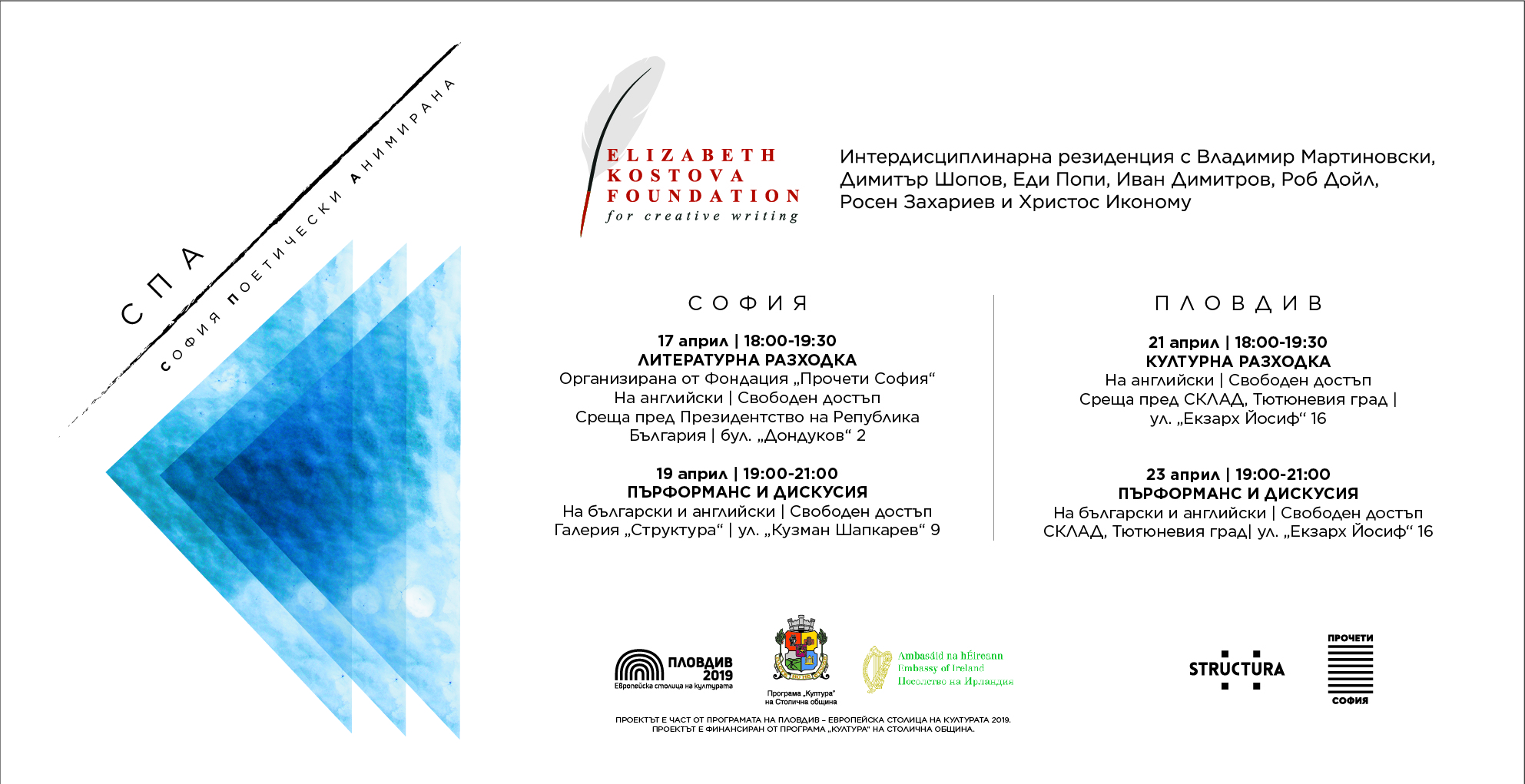 СПА (София поетически анимирана) е интердисциплинарна минирезиденция, която събира писатели от различни европейски държави, заедно с музиканти и визуални артисти. В света на СПА Европа е по-голяма от Европейския съюз, а литературата е източник на вдъхновение за други изкуства.