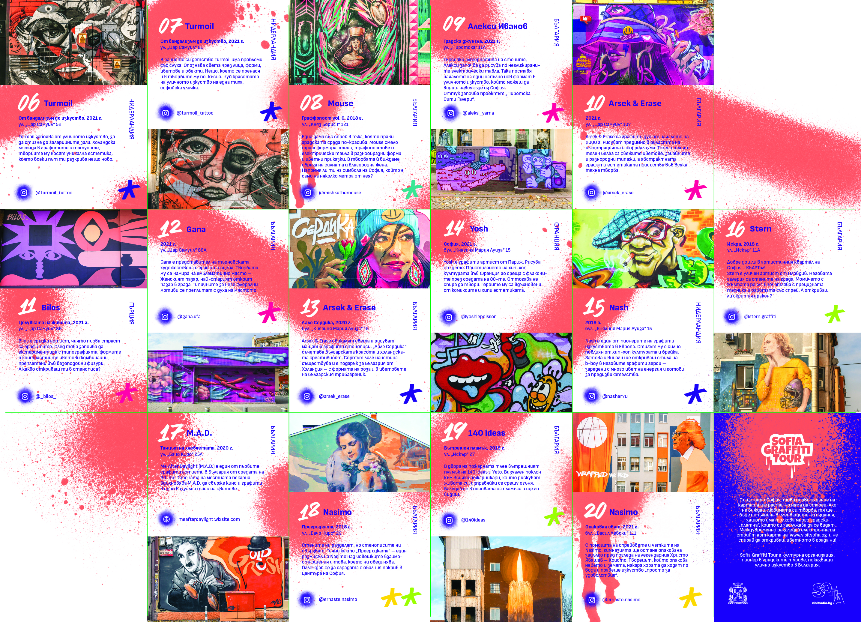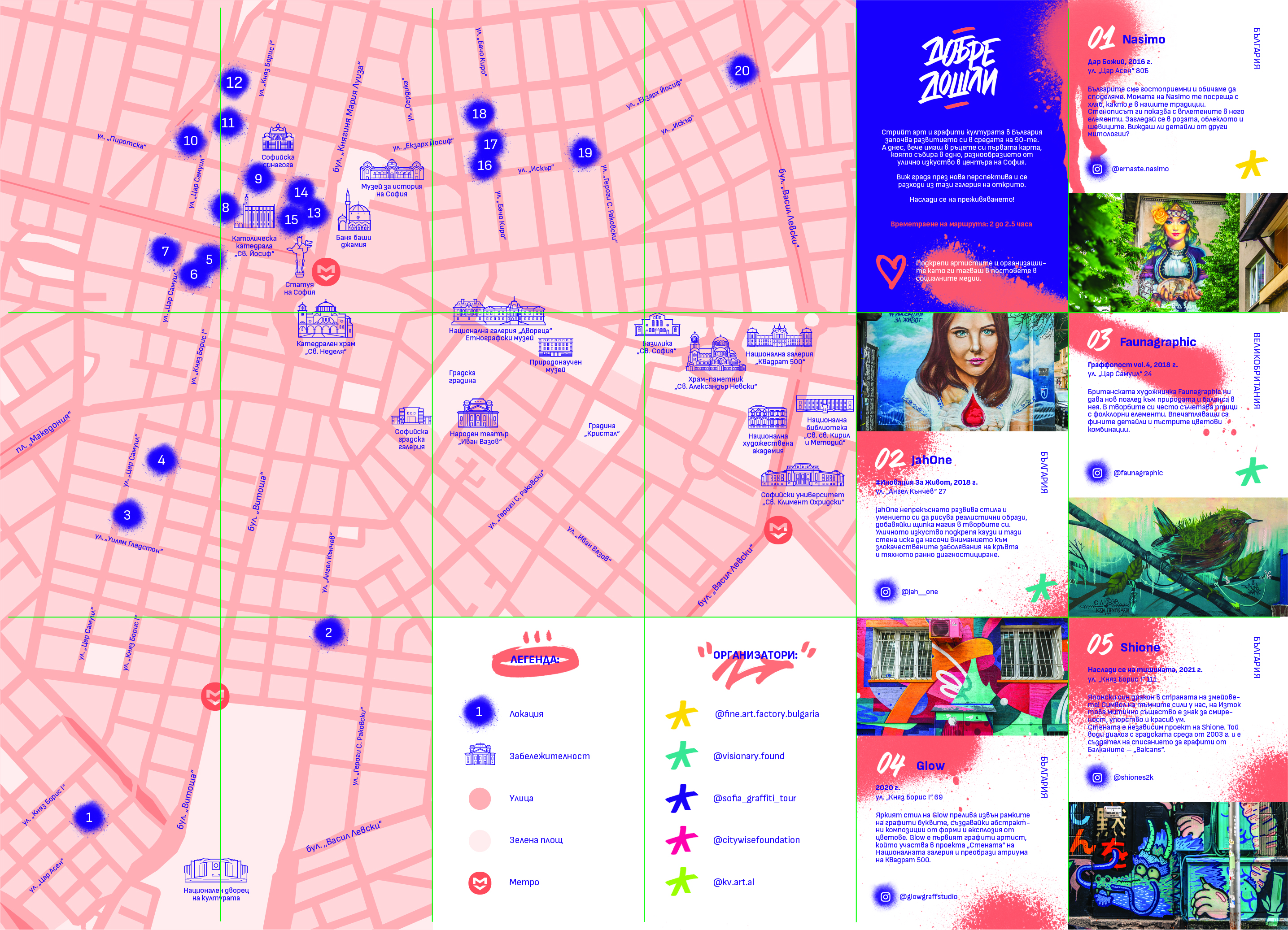 Картата STREET ART SOFIA е създадена по инициатива на Столична община в партньорство със Sofia Graffiti Tour. Тя включва 20 локации, в които са представени творби на 16 художници – 5 чуждестранни и 11 български. Картата съдържа информация и снимка за всяко произведение. Маршрутите са пешеходни, но може да се мине по тях и с велосипед или да се стигне с градски транспорт. Те показват София през погледа на художниците на уличното изкуство.