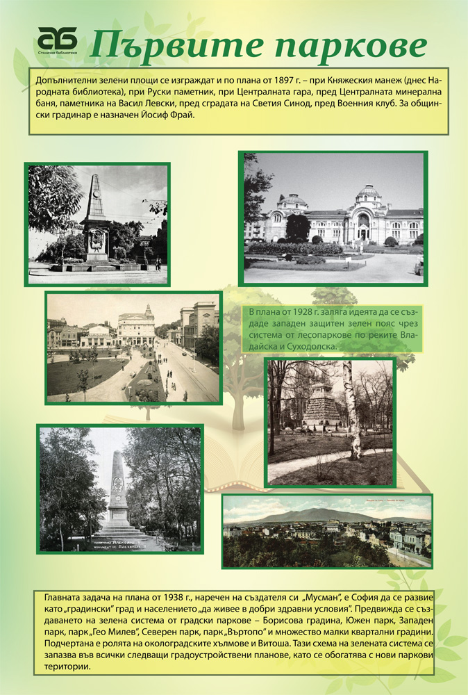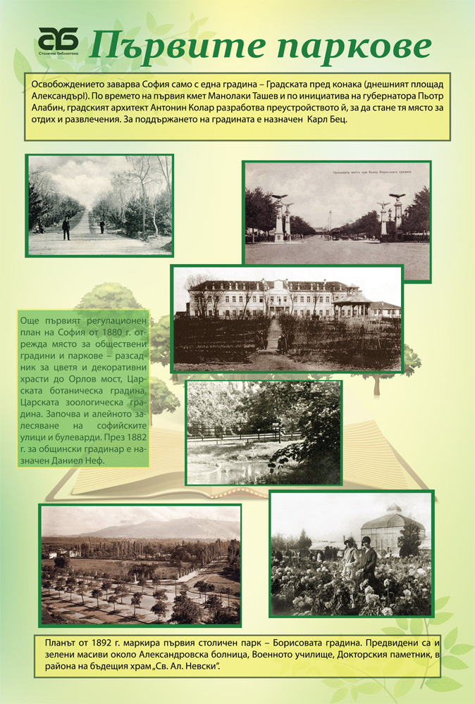 Посетителите на „Зелени библиотеки“ ще имат възможност да разгледат няколко тематични изложби. Документалната изложба с архивни материали от фонда на Столична библиотека „Из парковете на София – минало и настояще“ включва любопитни фотоси и документи от създаването и историята на софийските паркове, в които днес Столична библиотека провежда кампанията си.
