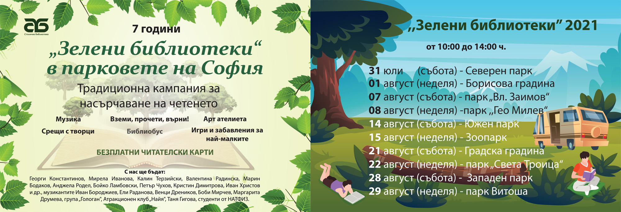 Седмото издание на „Зелени библиотеки“ в парковете на София стартира на 31 юли 2021 г. в Северен парк.