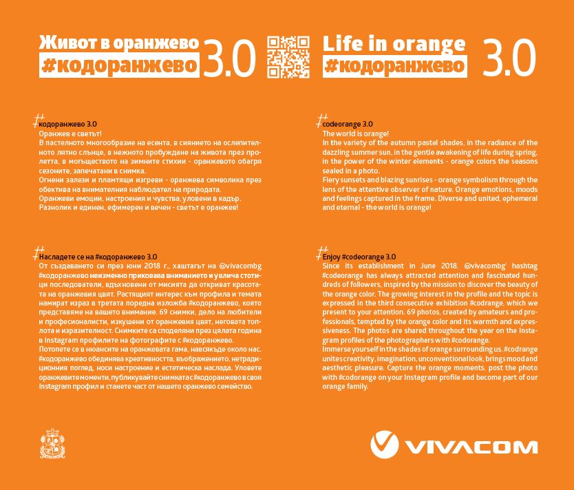 Кадрите разкриват оранжевите мигове в ежедневието, детайли от природата, лица, енергия, радост, настроение и провокират въображението. Снимките бяха споделяни през цялата година в Instagram профилите на фотографите и отбелязвани с #кодоранжево.