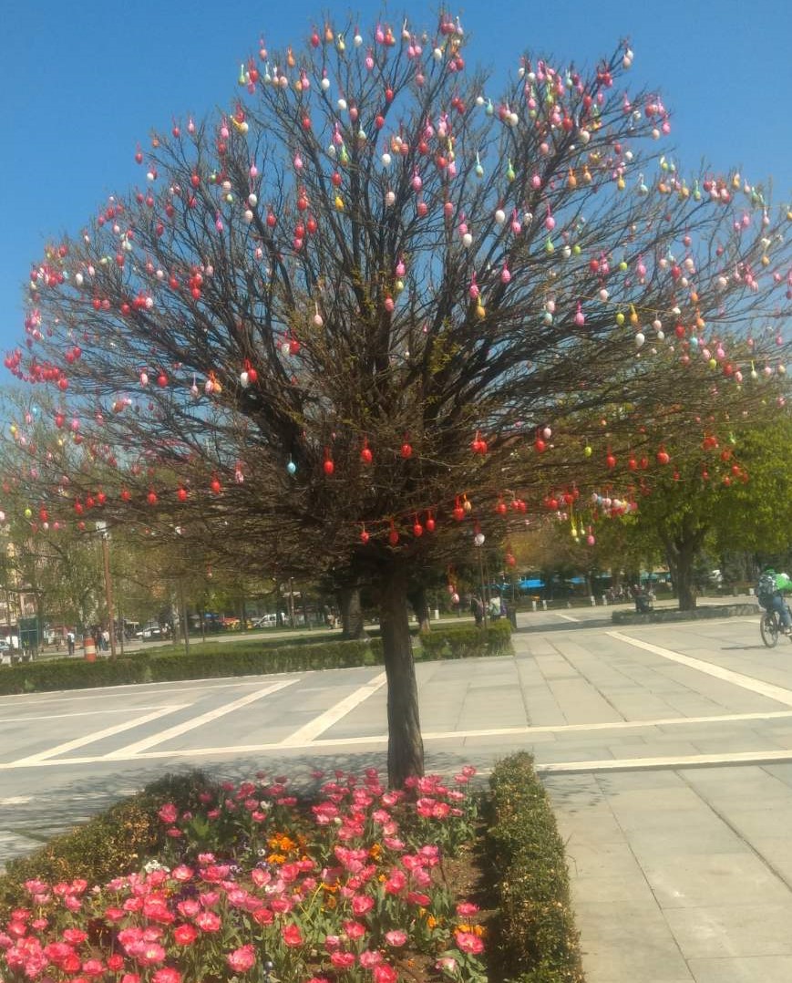Днес на Велики четвъртък, когато по традиция се боядисват яйца за Великден, екипи на дирекциите „Зелена система“ и „Култура“ украсиха едно от дърветата в парка на Националния дворец на културата с шарени декоративни яйца.