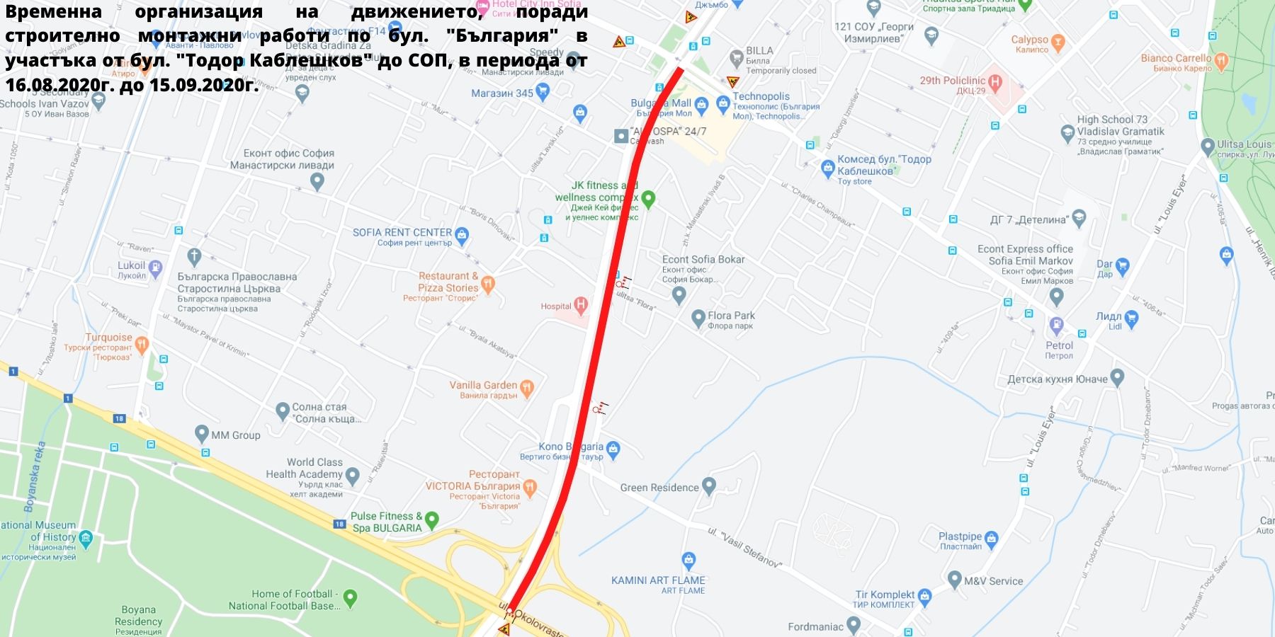 От 16.08.2020 г. до 14.09.2020 г. (включително) се забранява влизането на пътни превозни средства по пътно платно на бул. „България“ в участъка от ул. „Тодор Каблешков“ до "Софийски околовръстен път" в посока център, движението ще се извършва двупосочно в западното пътно платно на бул. „България“ в посочения участък.