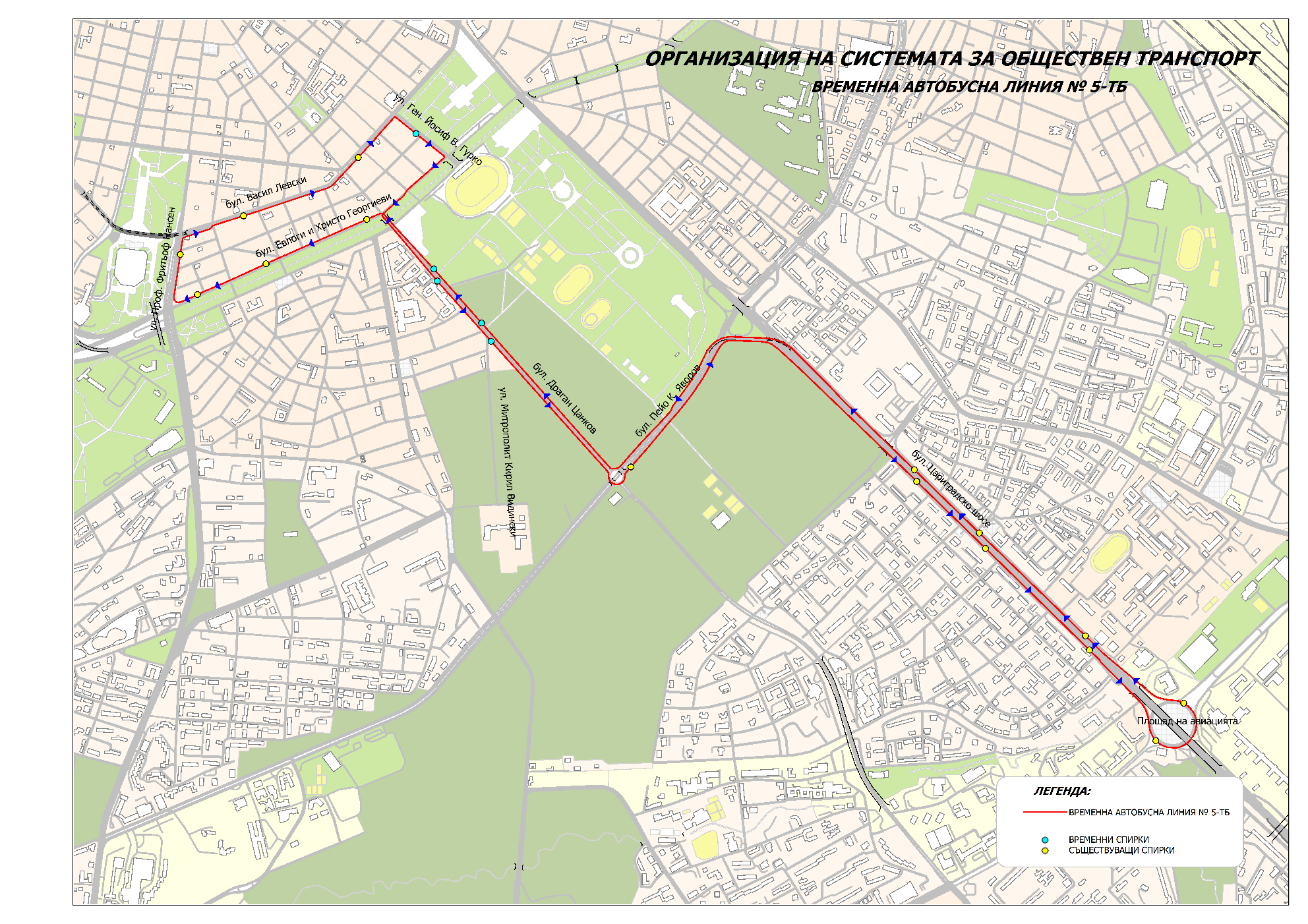 Временната автобусна линия №5-ТБ ще обслужва всички съществуващи спирки по маршрута ѝ, включително и разкритите временни спирки: