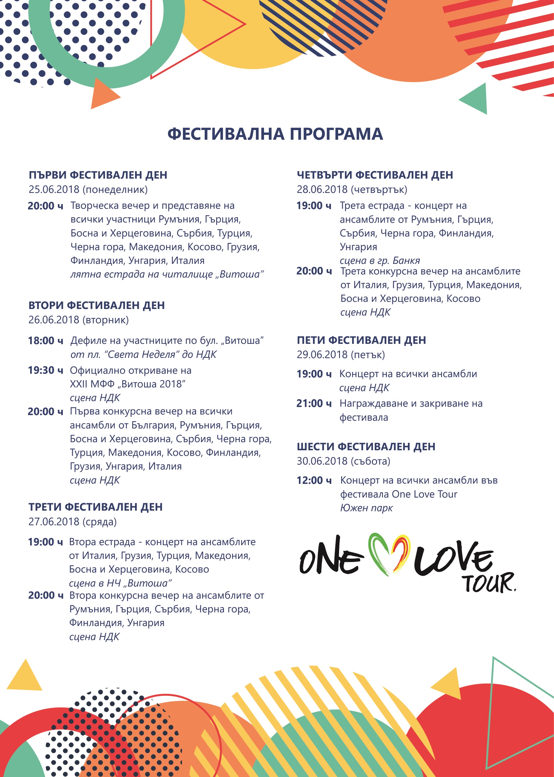 12:00 ч. – 13:30 ч. – Концерт на всички ансамбли във фестивала, One Love Tour‚ в Южен парк