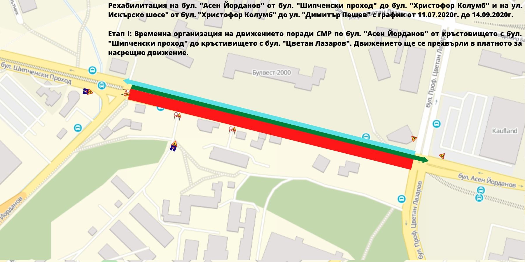 От 11 юли движението ще се извършва двупосочно в пътното платно в посока Център (от страната на Кауфланд). Другото пътно платно остава затворено за ремонт.