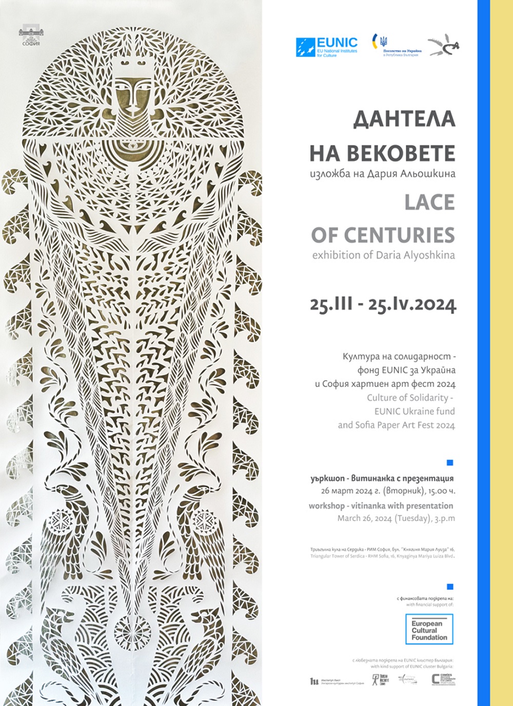 The State Institute for Culture is a partner of the exhibition with the author Ukrainian artist Daria Aloshkina. The project is happening thanks to the special program "Culture of Solidarity - EUNIC Fund for Ukraine", supported by the European Cultural Foundation and the Bulgarian cluster of EUNIC - Association of National European Cultural Institutes. The initiative has been embraced by the organizers of the Sofia Paper Art Fest and is included in the program of the Biennale in support of Ukraine and its presentation as part of the European cultural treasury. The exhibition is an important message to the modern world that calls for unity in the struggle for peace through culture.