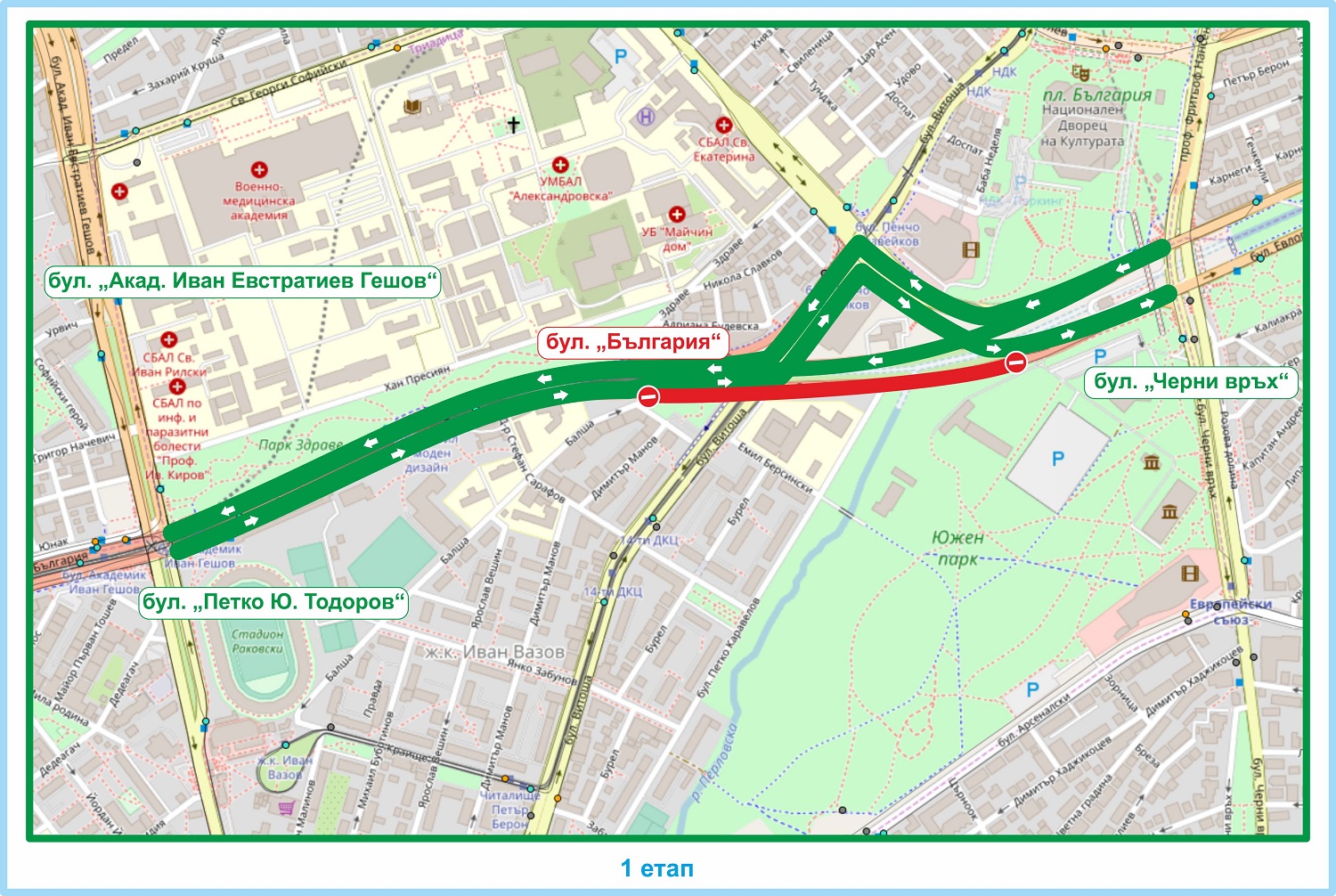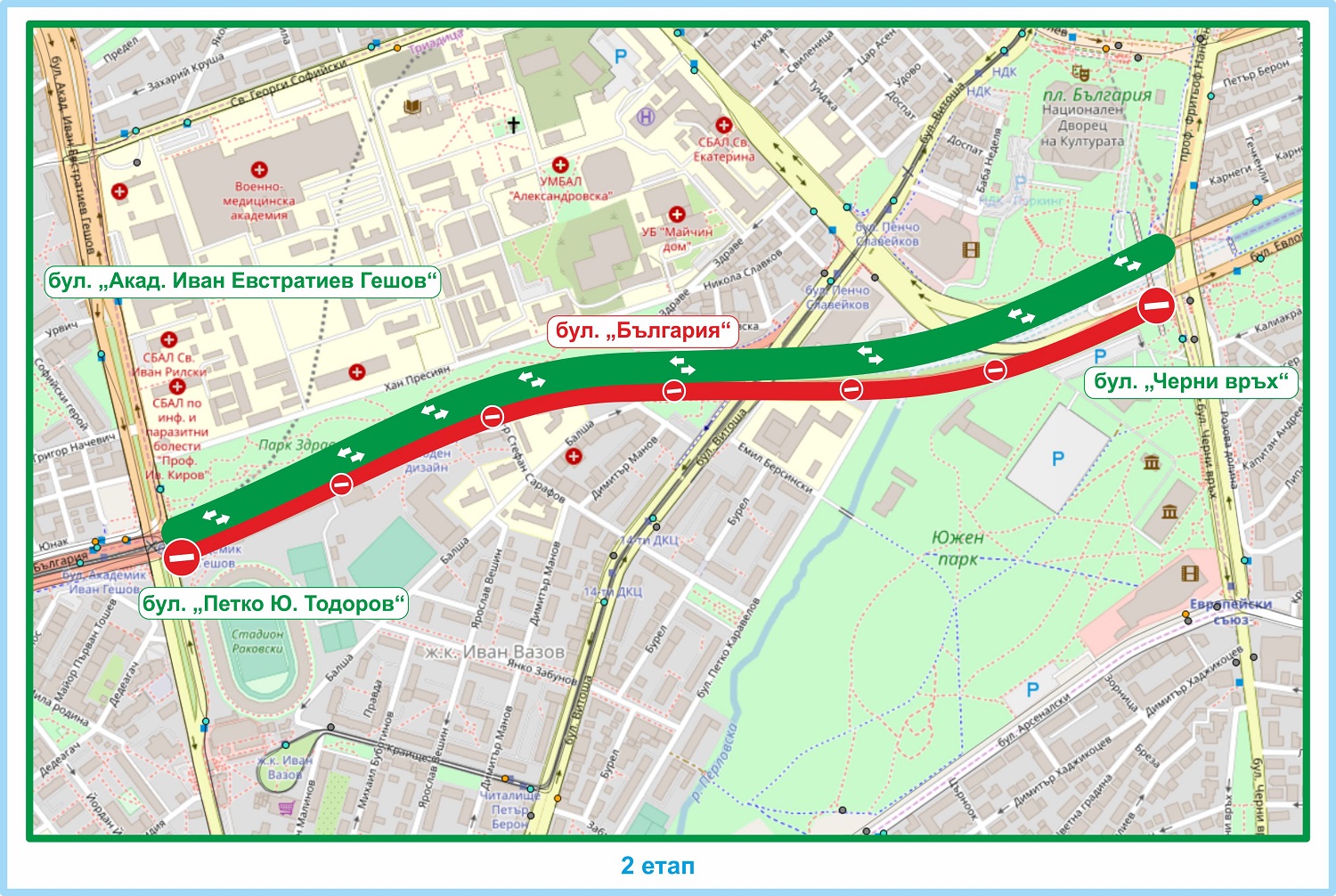 In the second stage from 05.07.2019 to 19.07.2019, the entry of vehicles is forbidden on the southern roadway of “Bulgaria” Blvd. in the section from “Akad. Ivan Ev. Geshov" Blvd. to "Cherni Vrah" Blvd., where the traffic will flow in both directions on the north roadway of the boulevard in the same section.