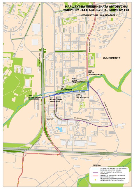 Обединяват се автобусни линии № 113 (с маршрут ж.к. "Младост 1" – бл. 480 ж.к. "Младост 4") и автобусна линия № 314 (с маршрут ж.к. „Младост 1" – с. Бистрица) в една линия под № 314 с маршрут: от с. Бистрица по действащия маршрут на линия № 314 кръстовище ул. „Д-р Атанас Москов“/ул. „Самара“, направо по ул. „Самара“ до ул. „Филип Аврамов“, по ул. „Филип Аврамов“ по маршрута на линия № 113 до ул. „Свето Преображение“ (община "Младост") и по маршрута си до ж.к. "Младост 1". Автобусите ще спират на всички съществуващи автобусни спирки в променения участък на маршрута.