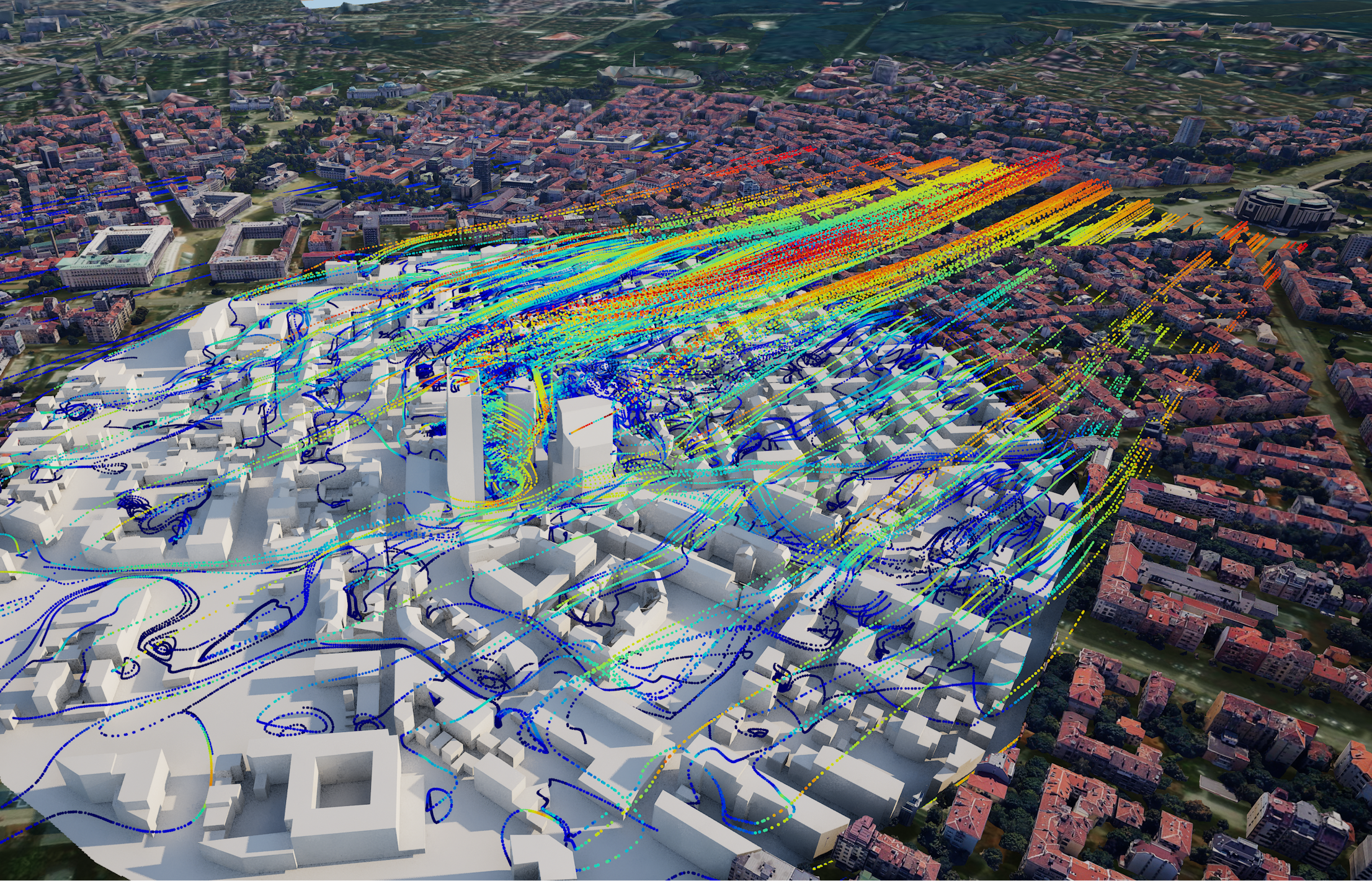 Картите визуализират траекториите на въздушните течения в район от центъра на София при преобладаващи ветрове от север-северозапад. Анализът е извършен със софтуер за мултифизика – Аnsys®, а за пълно пренасяне в градската среда, резултатите са визуализирани и в Unreal Engine®. Линиите и цветовете илюстрират движението и скоростта на въздуха, разкривайки завихряния и ускорения между високите сгради, които влияят на качеството на въздуха и топлинния комфорт.